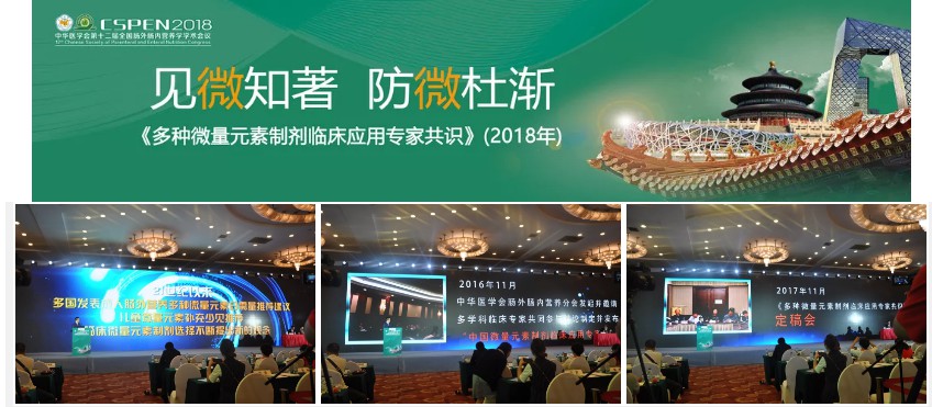 2018年08月25日中华医学会第十二届全国肠外肠内营养学学术会议在北京九华山庄召开,由中华医学会肠外肠内营养学分会(简称“CSPEN”)前任主任委员于健春教授主持编撰的《多种微量元素制剂临床应用专家共识》(2018年)(简称“共识”)在会上隆重发布,并邀请中国医学科学院北京协和医院陈伟教授进行深入解读。该共识为国内首篇根据临床不同病症,对微量元素的补充提出全面推荐意见的权威论著。